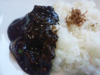 上の写真だと、分かりにくいですが、ライスにかけると、その黒さは良く分かります。