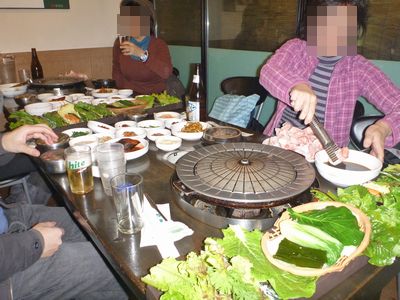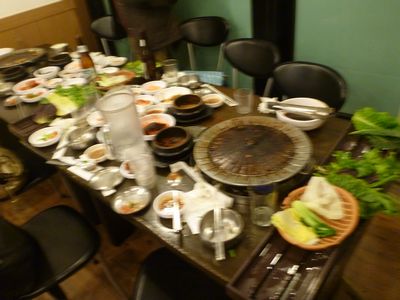 ですので、肉〔7000W)×4人前=28000W (日本円にして2200円程度)