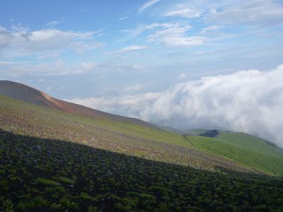 6合目を過ぎて、7号目が近くなる頃、快晴となり・・・いや、雲の上に出たのである。