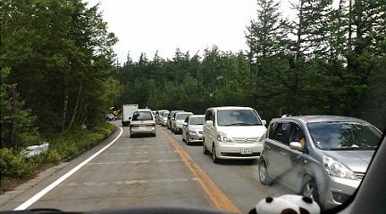 写真は、スバルラインの中腹です。 凄い渋滞。確かに3時間渋滞はありえる話です。