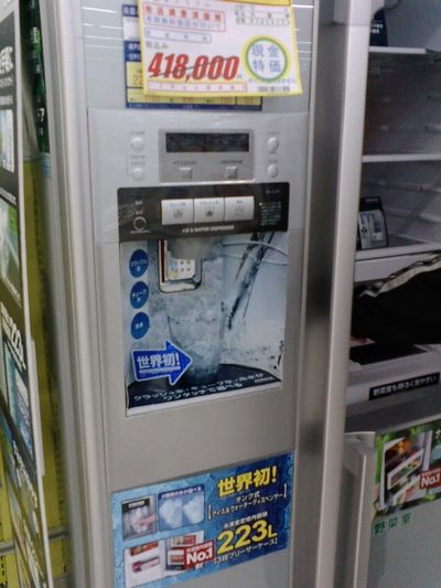冷蔵庫にドアに、コップ置き場があり、氷と冷水が落ちてくるという冷蔵庫。