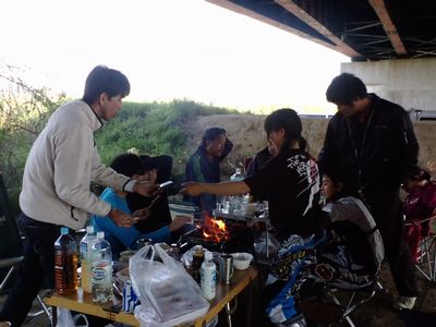 高速道路の下で雨をしのいで、BBQ開始