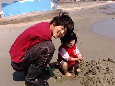 腹いっぱい食べたら、お店の前の海岸で砂遊び♪