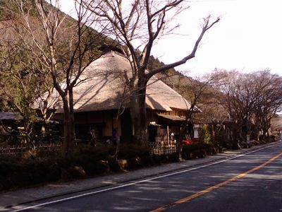 わらぶき屋根で出来た建物は、旧街道、二子山の前