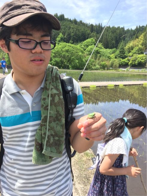 途中に田んぼで遊んで、街中に戻ってきました。
