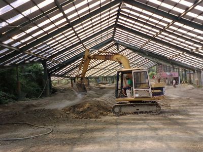 ちゃちょうはブルで、コースを慣らしており、奥でシャベルが
