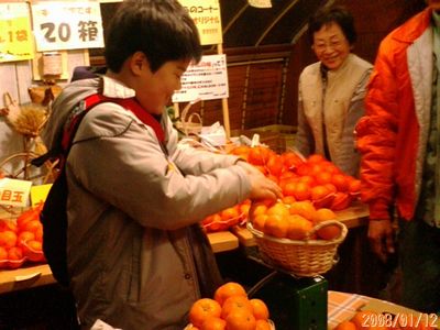 みかんやさんは、今日が、今年初めての開店日で、みかんのカゴ盛りゲームをやっていた。