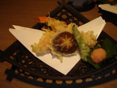 コース料理は、くるみ豆腐、お刺身、伊勢海老ねぎ味噌焼き、阿波尾鶏のつみれ豆乳鍋、天ぷら、鯛茶漬け