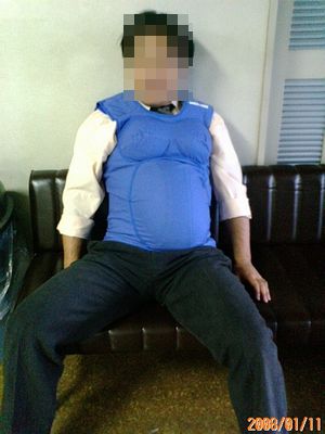 おなかに8Kの重りを付いたエプロン上の服を着て
