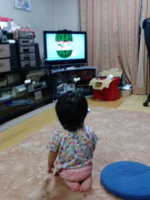 音楽が鳴り始めると、テレビの前に正座するユライ。