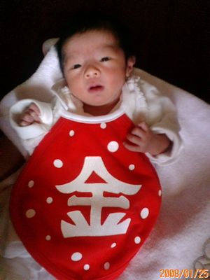 よだれかけが、一枚の洋服に見えます。「金」がなければ・・・